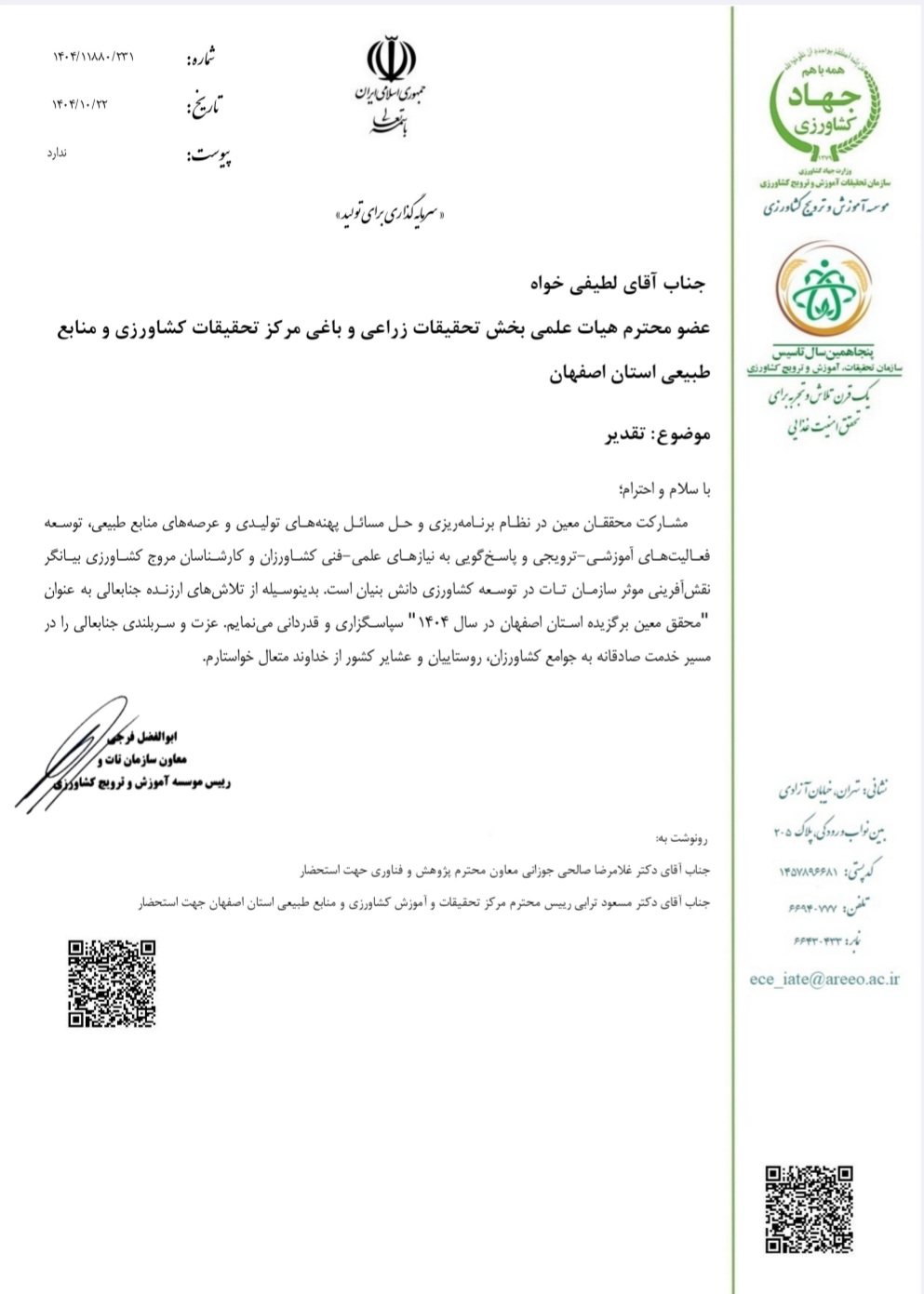 انتخاب شایسته دکتر ابراهیم لطیفی خواه ، عضو هیات علمی مرکز تحقیقات و آموزش کشاورزی و منابع طبیعی استان اصفهان ، به عنوان محقق معین برگزیده استان اصفهان در سال ۱۴۰۴